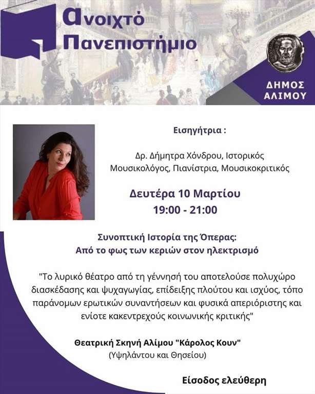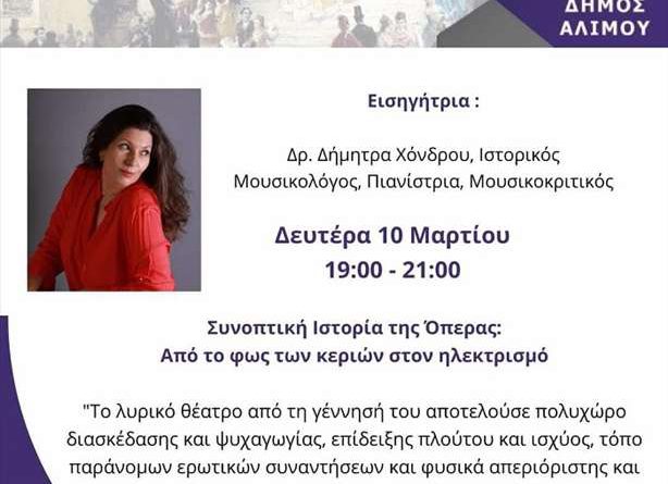 Τη Δευτέρα 10 Μαρτίου, στις 7 μ.μ., το Ανοιχτό Πανεπιστήμιο του Δήμου Αλίμου φιλοξενεί την Δρ. Δήμητρα Χόνδρου, Ιστορικό Μουσικολόγο, Πιανίστρια και Μουσικοκριτικό σε μια άκρως ενδιαφέρουσα διάλεξη για την Όπερα. Η ομιλία που θα πραγματοποιηθεί στη Θεατρική Σκηνή «Κάρολος Κουν» (Υψηλάντου & Θησείου) θα διαρκέσει από τις 7 έως τις 9 μ.μ. . Η είσοδος είναι ελεύθερη.