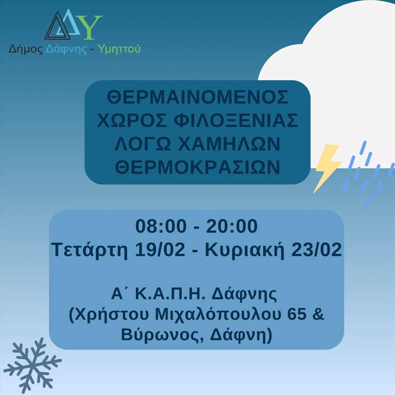 Ο Δήμος Δάφνης-Υμηττού θέτει σε λειτουργία θερμαινόμενο χώρο φιλοξενίας στο Α’ Κ.Α.Π.Η. Δάφνης (Χρήστου Μιχαλόπουλου 65 & Βύρωνος, Δάφνη) λόγω των έντονων καιρικών φαινομένων για τη φιλοξενία και προστασία πολιτών από το ψύχος, από την Τετάρτη 19 Φεβρουαρίου έως και την Κυριακή 23 Φεβρουαρίου, 08:00 – 20:00.