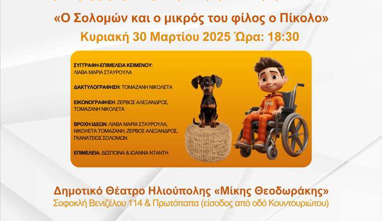Ο Δήμος Ηλιούπολης με αφορμή την Παγκόσμια Ημέρα Συνδρόμου Down και την Παγκόσμια Ημέρα Ενημέρωσης για τον Αυτισμό, έχει την τιμή να σας προσκαλέσει την Κυριακή 30 Μαρτίου στις 18:30 μ.μ. στο Δημοτικό Θέατρο Ηλιούπολης «Μίκης Θεοδωράκης» όπου θα γίνει η παρουσίαση του παιδικού βιβλίου «Ο Σολομών και ο μικρός του φίλος ο Πίκολο» το οποίο έγραψαν και εικονογράφησαν ενήλικες με εγκεφαλική παράλυση της ΑΜΚΕ «Ιοί και Κόρες».