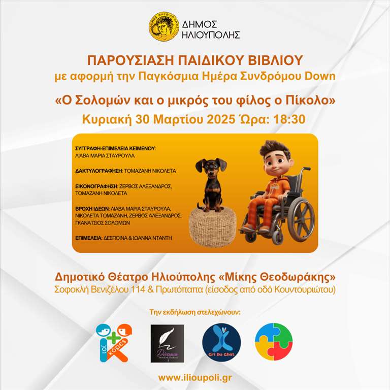 Ο Δήμος Ηλιούπολης με αφορμή την Παγκόσμια Ημέρα Συνδρόμου Down και την Παγκόσμια Ημέρα Ενημέρωσης για τον Αυτισμό, έχει την τιμή να σας προσκαλέσει την Κυριακή 30 Μαρτίου στις 18:30 μ.μ. στο Δημοτικό Θέατρο Ηλιούπολης «Μίκης Θεοδωράκης» όπου θα γίνει η παρουσίαση του παιδικού βιβλίου «Ο Σολομών και ο μικρός του φίλος ο Πίκολο» το οποίο έγραψαν και εικονογράφησαν ενήλικες με εγκεφαλική παράλυση της ΑΜΚΕ «Ιοί και Κόρες».
