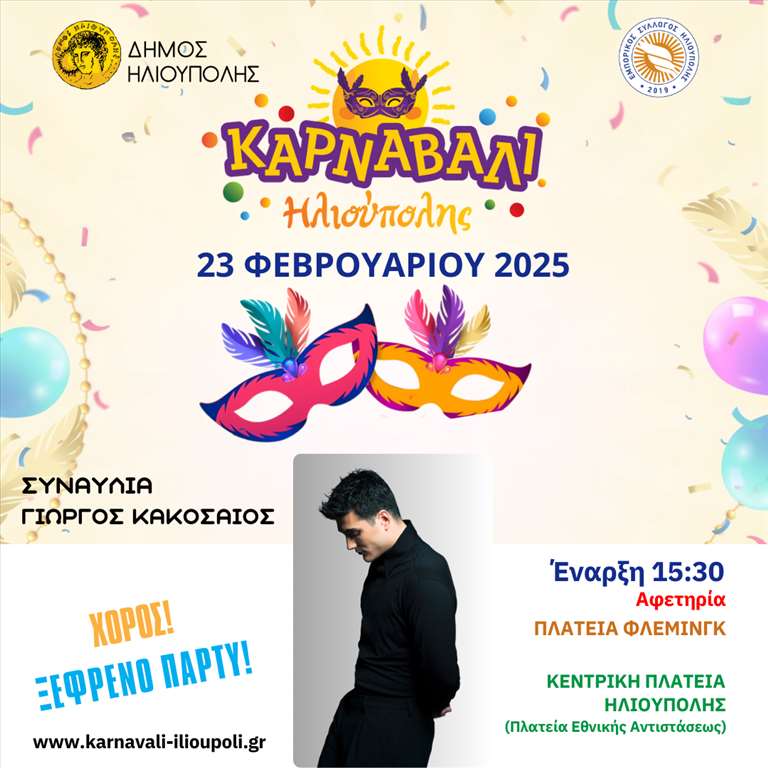 ► Στις 23 Φεβρουαρίου 2025 μετά την Καρναβαλική Παρέλαση θα ακολουθήσει συναυλία με τον ΓΙΩΡΓΟ ΚΑΚΟΣΑΙΟ στην Πλατεία Εθνικής Αντίστασης.