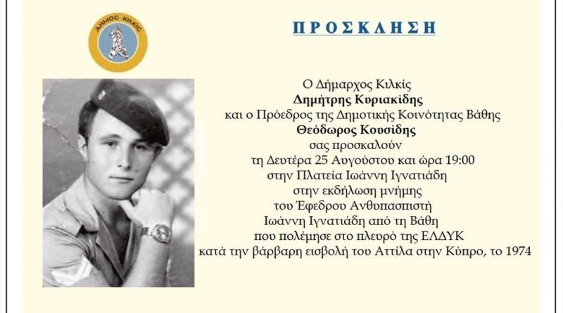 Ο Δήμος Κιλκίς και η Δημοτική Κοινότητα Βάθης αποτίουν τον οφειλόμενο φόρο τιμής στον έφεδρο ανθυπασπιστή Ιωάννη Ιγνατιάδη, τον μοναδικό Κιλκισιώτη αγνοούμενο που πολέμησε εναντίον του Αττίλα στην τριήμερη άνιση μάχη της Ελληνικής Δύναμης Κύπρου (ΕΛ.ΔΥ.Κ) τον μαύρο Αύγουστο του 1974, κατά τη δεύτερη εισβολή ισχυρών τουρκικών αρμάτων και πεζικού στη μαρτυρική Κύπρο.