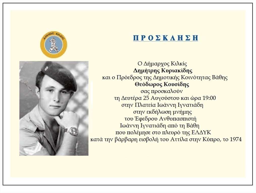 Ο Δήμος Κιλκίς και η Δημοτική Κοινότητα Βάθης αποτίουν τον οφειλόμενο φόρο τιμής στον έφεδρο ανθυπασπιστή Ιωάννη Ιγνατιάδη, τον μοναδικό Κιλκισιώτη αγνοούμενο που πολέμησε εναντίον του Αττίλα στην τριήμερη άνιση μάχη της Ελληνικής Δύναμης Κύπρου (ΕΛ.ΔΥ.Κ) τον μαύρο Αύγουστο του 1974, κατά τη δεύτερη εισβολή ισχυρών τουρκικών αρμάτων και πεζικού στη μαρτυρική Κύπρο.