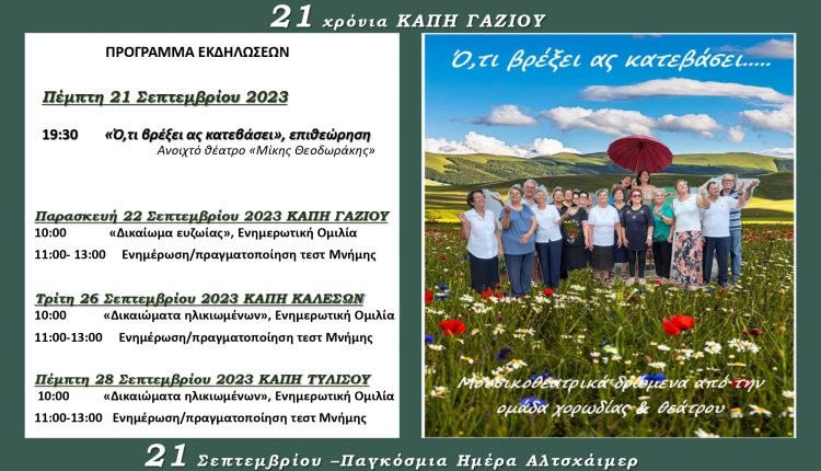 Παράλληλα με αφορμή την Παγκόσμια Ημέρα Αλτσχάιμερ θα πραγματοποιηθούν στα ΚΑΠΗ Γαζίου την Παρασκευή 22 Σεπτεμβρίου, στο ΚΑΠΗ Καλεσών την Τρίτη 26/9 και στο ΚΑΠΗ Τυλίσου την Πέμπτη 28 του μήνα ομιλίες για τα δικαιώματα των ηλικιωμένων καθώς και τεστ μνήμης.