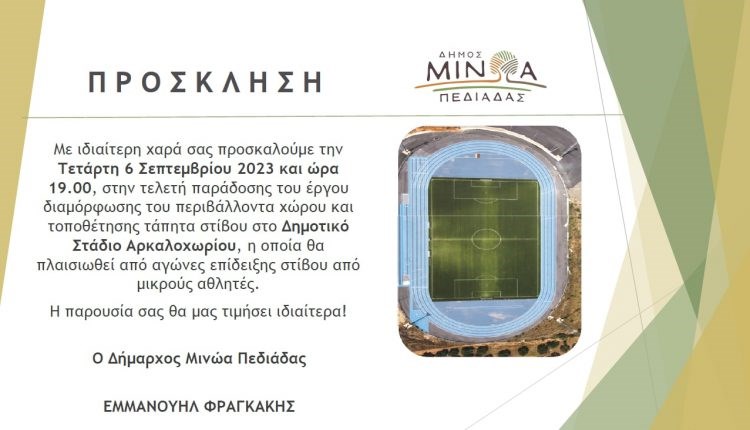 Την Τετάρτη 6 Σεπτεμβρίου και ώρα 19.00, θα πραγματοποιηθεί η τελετή παράδοσης του έργου διαμόρφωσης του περιβάλλοντα χώρου και τοποθέτησης τάπητα στίβου, στο Δημοτικό Στάδιο Αρκαλοχωρίου.