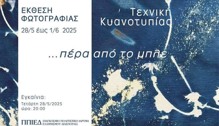 Την Τετάρτη 28 Μαΐου και ώρα 20:00, στο Παγκόσμιο Πολιτιστικό Ίδρυμα Ελληνισμού Διασποράς (ΠΠΙΕΔ)-Μουσείο Μικρασιατικού Ελληνισμού "Φιλιώ Χαϊδεμένου", εγκαινιάζεται η έκθεση φωτογραφίας με τίτλο : …πέρα από το μπλε, που διοργανώνει το εργαστήρι Αναλογικής Φωτογραφίας του Τμήματος Πολιτισμού του Δήμου Νέας Φιλαδέλφειας – Νέας Χαλκηδόνας.