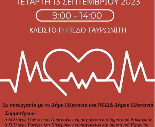 Ο Δήμος Πλατανιά, το ΝΠΔΔ Δήμου Πλατανιά, ο Σύλλογος Εθελοντών Αιμοδοτών Νομού Χανίων ο “Άγιος Ιωάννης” και το Τμήμα Αιμοδοσίας του Γ. Νοσοκομείου Χανίων ο “Άγιος Γεώργιος”, θα πραγματοποιήσουν την Τετάρτη 13 Σεπτεμβρίου 2023, εθελοντική αιμοδοσία στο Κλειστό Γήπεδο Ταυρωνίτη από τις 09:00π.μ. έως τις 14:00μ.μ., κατά τη διάρκεια της εθελοντικής δράσης θα γίνεται και δειγματοληψία μυελού των οστών.