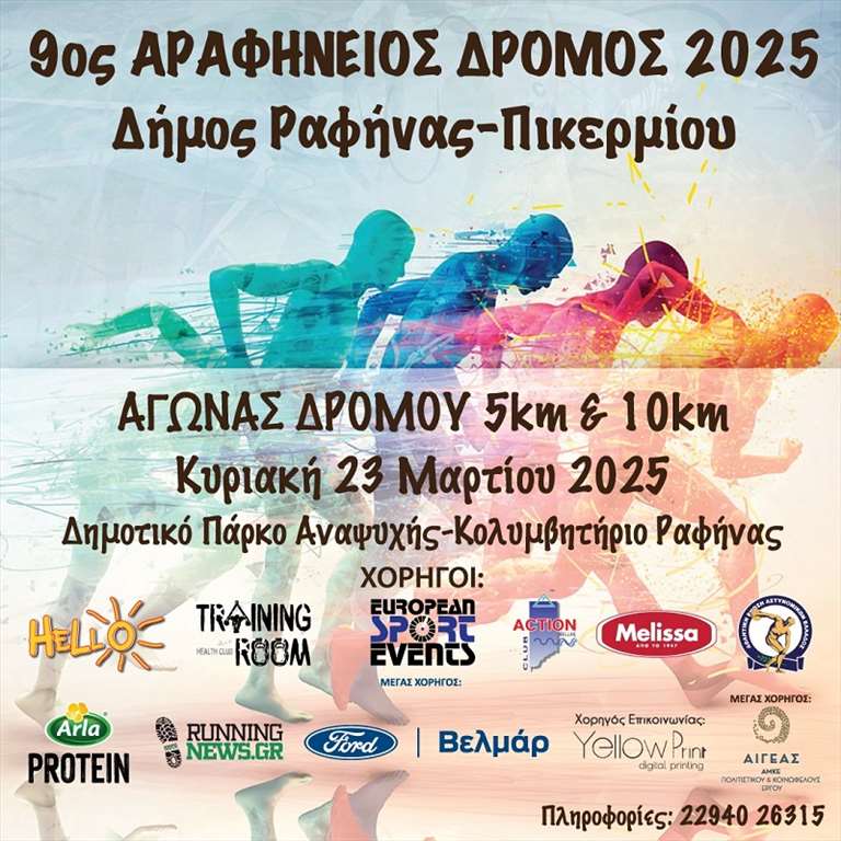 Ο Δήμος Ραφήνας – Πικερμίου και ο ΔΑΣ ΑΡΑΦΗΝ πραγματοποιούν αύριο Κυριακή 23 Μαρτίου 2025 τον μεγαλύτερο, αθλητικό και όχι μόνο, θεσμό του, τον «9ο ΑΡΑΦΗΝΕΙΟ ΔΡΟΜΟ», που περιλαμβάνει αγώνα δρόμου 10 χλμ, 5 χλμ και 1 χλμ παιδικό. Η διαδρομή είναι σχεδιασμένη ώστε οι δρομείς να περνούν από χαρακτηριστικά σημεία του τόπου μας. Σας καλούμε να παρευρεθείτε κατά μήκος της διαδρομής και να χειροκροτήσετε μικρούς και μεγάλους δρομείς.
