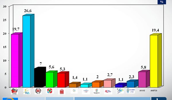 Στην πρόθεση ψήφου με όλες τις απαντήσεις η ΝΔ καταγράφει 34,5%, ο ΣΥΡΙΖΑ συγκεντρώνει 24%, το Κίνημα Αλλαγής 6,5%, το ΚΚΕ 6%, η Ελληνική Λύση 4,5%, το ΜέΡΑ 25 3%, και οι Έλληνες 1,5%.