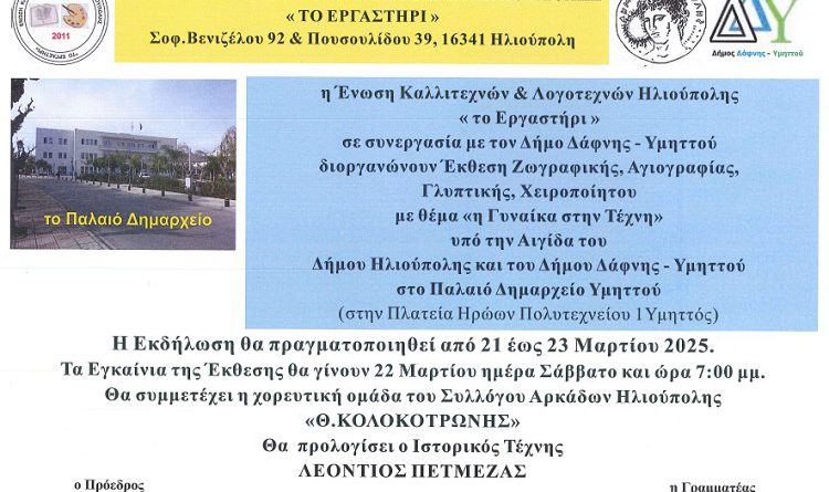 Η Ένωση Καλλιτεχνών & Λογοτεχνών Ηλιούπολης «Το Εργαστήρι» σε συνεργασία με τον Δήμο Δάφνης – Υμηττού διοργανώνουν Έκθεση Ζωγραφικής, Αγιογραφίας, Γλυπτικής και Χειροποίητου με θέμα «η Γυναίκα στην Τέχνη» υπό την αιγίδα του Δήμου Ηλιούπολης και του Δήμου Δάφνης – Υμηττού, στο Παλαιό Δημαρχείο Υμηττού (Πλατεία Ηρώων Πολυτεχνείου 1, Υμηττός).