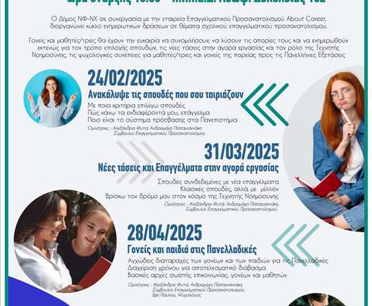 Ο Δήμος Νέας Φιλαδέλφειας-Νέας Χαλκηδόνας, σε συνεργασία με την εταιρεία Επαγγελματικού Προσανατολισμού About Career, διοργανώνει έναν κύκλο δωρεάν ενημερωτικών παρουσιάσεων, με σκοπό να βοηθήσει μαθητές/τριες και γονείς να κατανοήσουν και να γνωρίσουν τον τρόπο που θα επιλέξουν τη μελλοντική επαγγελματική τους πορεία, μέσα σε έναν κόσμο που διαρκώς αλλάζει.