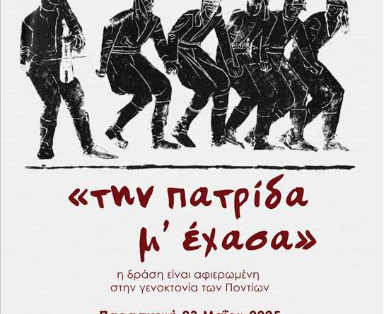 Η ομάδα παραδοσιακών χορών των ΚΑΠΗ Δήμου Νίκαιας-Αγ.Ι. Ρέντη, πραγματοποιεί εκδήλωση με τίτλο «Την πατρίδα μ’ έχασα», την Παρασκευή 23 Μαΐου και ώρα 9.30 π.μ, στην πλατεία Παιδικής Στέγης. Η δράση είναι αφιερωμένη στη μνήμη της Γενοκτονίας των Ποντίων, τιμώντας την ιστορική μνήμη μέσα από τη δύναμη του χορού και της συλλογικής έκφρασης. Τη διοργάνωση έχει αναλάβει η Διεύθυνση Κοινωνικής Προστασίας, Ισότητας και Τρίτης Ηλικίας Δήμου Νίκαιας – Αγ. Ι. Ρέντη, Τμήμα Α & Β ΚΑΠΗ σε συνεργασία με τη Διεύθυνση Αθλητισμού.