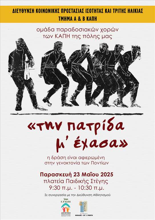 Η ομάδα παραδοσιακών χορών των ΚΑΠΗ Δήμου Νίκαιας-Αγ.Ι. Ρέντη, πραγματοποιεί εκδήλωση με τίτλο «Την πατρίδα μ’ έχασα», την Παρασκευή 23 Μαΐου και ώρα 9.30 π.μ, στην πλατεία Παιδικής Στέγης. Η δράση είναι αφιερωμένη στη μνήμη της Γενοκτονίας των Ποντίων, τιμώντας την ιστορική μνήμη μέσα από τη δύναμη του χορού και της συλλογικής έκφρασης. Τη διοργάνωση έχει αναλάβει η Διεύθυνση Κοινωνικής Προστασίας, Ισότητας και Τρίτης Ηλικίας Δήμου Νίκαιας – Αγ. Ι. Ρέντη, Τμήμα Α & Β ΚΑΠΗ σε συνεργασία με τη Διεύθυνση Αθλητισμού.