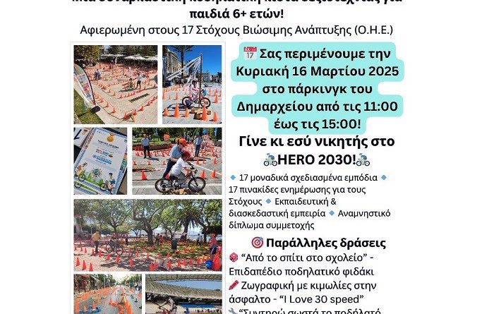 Ο Δήμος Ηλιούπολης, σε συνεργασία με την Cycling Greece, διοργανώνει τη δράση "HERO 2030" στο πλαίσιο του ΔΕΗ TOUR OF HELLAS 2025. Πρόκειται για μια συναρπαστική ποδηλατική πίστα δεξιοτεχνίας, ειδικά σχεδιασμένη για παιδιά ηλικίας 6 ετών και άνω, με στόχο την εκπαίδευση και την ευαισθητοποίησή τους γύρω από την οδική ασφάλεια και τη βιώσιμη ανάπτυξη. Η εκδήλωση είναι αφιερωμένη στους 17 Στόχους Βιώσιμης Ανάπτυξης του ΟΗΕ, προωθώντας τη σημασία της οικολογικής μετακίνησης και της υπεύθυνης συμπεριφοράς στους δρόμους.