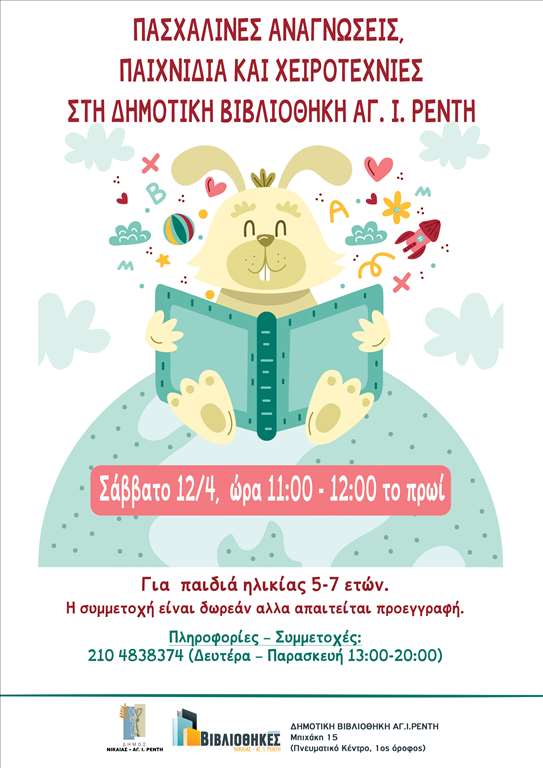 Στη Δημοτική Βιβλιοθήκη Αγ.Ι. Ρέντη (Μπιχάκη 15) την ίδια μέρα στις 11.00 π.μ , παιδιά ηλικία 5-7 ετών θα έχουν την ευκαιρία να ανακαλύψουν «Πού πήγε το Πάσχα» μέσα από το βιβλίο του Βαγγέλη Ηλιόπουλου, θα παίξουν αυγο-δρομίες και θα φτιάξουν πασχαλινά καλαθάκια από χαρτί.