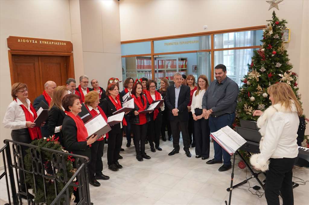 Ακολούθως η χορωδία της ΣΕΑΠ συνοδεία ποντιακής λύρας έψαλε τα παραδοσιακά κάλαντα του Πόντου. Ο Περιφερειάρχης ευχαρίστησε για την επίσκεψη τον επικεφαλής της χορωδίας ανθυπολοχαγό πεζικού Μανόλη Πολυχρονάκη.