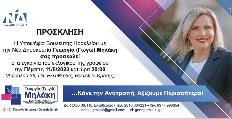 Κάλεσμα στα εγκαίνια του εκλογικού της γραφείου που θα πραγματοποιηθούν την Πέμπτη 11 Μαΐου 2023 στις 20:00, απευθύνει προς τους πολίτες η υποψήφια βουλευτής νομού Ηρακλείου της ΝΔ, Γεωργία (Γωγώ) Μηλάκη.