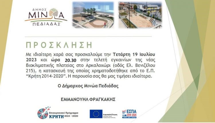 Με ιδιαίτερη χαρά σας προσκαλούμε την Τετάρτη 19 Ιουλίου και ώρα 20.30, στην τελετή εγκαινίων της νέας βιοκλιματικής πλατείας στο Αρκαλοχώρι (οδός ΕΛ. Βενιζέλου 215), η κατασκευή της οποίας χρηματοδοτήθηκε από το .Ε.Π ¨Κρήτη 2014-2020″.