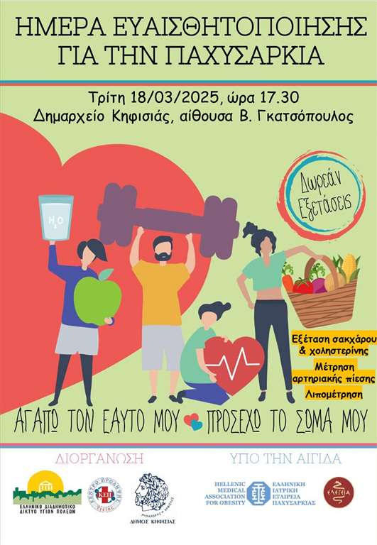 Με αφορμή την Παγκόσμια Ημέρα Παχυσαρκίας, ο Εντεταλμένος Σύμβουλος του ΚΕΠ Υγείας του Δήμου Κηφισιάς κ. Χρήστος Λούμπιας σε συνεργασία με το Ελληνικό Διαδημοτικό Δίκτυο Υγιών Πόλεων (ΕΔΔΥΠΠΥ), υπό την αιγίδα της Ελληνικής Ιατρικής Εταιρείας Παχυσαρκίας και της Ελληνικής Εταιρείας Γενικής Ιατρικής, διοργανώνουν μία σημαντική εκδήλωση με θέμα: «Ευαισθητοποίηση για την Παχυσαρκία» την Τρίτη 18 Μαρτίου στο Δημαρχείο Κηφισιάς (αίθουσα Β. Γκατσόπουλος)
