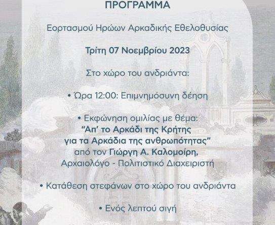 Ο Δήμος Ανωγείων θέλοντας να τιμήσει τη μνήμη των Ηρώων της Αρκαδικής Εθελοθυσίας, σας προσκαλεί στην εκδήλωση που θα πραγματοποιηθεί στο χώρο του Ανδριάντα του Ήρωα Εμμανουήλ Βασιλείου Αναγνώστου Σκουλά, Πυρπολητή της Ιεράς Μονής Αρκαδίου , στις 7 Νοεμβρίου 2023, ημέρα Τρίτη και ώρα 12 μ.μ.