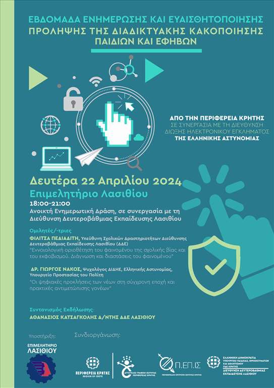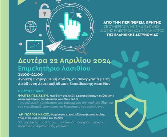 Η Διεύθυνση Δευτεροβάθμιας Εκπαίδευσης Λασιθίου με την στήριξη της Περιφέρειας Κρήτης και την υποστήριξη του Επιμελητήριου Λασιθίου, διοργανώνουν ανοικτή ενημερωτική δράση που αφορά στην «Πρόληψη της Διαδικτυακής Κακοποίησης Παιδιών και Εφήβων», τη Δευτέρα 22 Απριλίου 2024 και ώρα 18:00 στο Επιμελητήριο Λασιθίου στον Άγιο Νικόλαο.