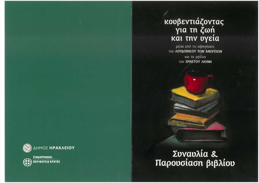Στο πλαίσιο της εκδήλωσης, με την στήριξη της Περιφέρειας Κρήτης και του Δήμου Ηρακλείου, θα γίνει η παρουσίαση του βιβλίου «Κουβεντιάζοντας για τη ζωή και την υγεία» του Ομότιμου Καθηγητή Ιατρικής Σχολής του Πανεπιστημίου Κρήτης, Χρήστου Λιονή, πάνω σε κείμενα του Λουδοβίκου των Ανωγείων.