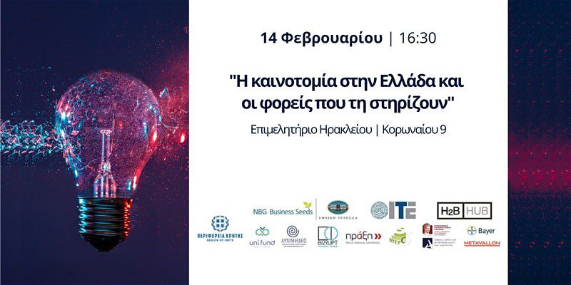 Εκδήλωση με θέμα «Η καινοτομία στην Ελλάδα και οι φορείς που τη στηρίζουν» θα πραγματοποιηθεί την Παρασκευή 14 Φεβρουαρίου 2020 και ώρα 16:30 στο Επιμελητήριο Ηρακλείου, με τη συμμετοχή θεσμικών φορέων και επιχειρήσεων από την Αθήνα και την Κρήτη.