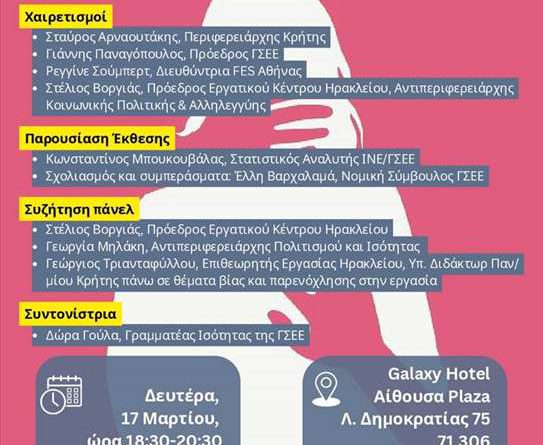 H Περιφέρεια Κρήτης, η Γενική Συνομοσπονδία Εργατών Ελλάδας (ΓΣΕΕ), το Εργατικό Κέντρο Ηρακλείου, η Γραμματεία Ισότητας της ΓΣΕΕ, το Ίδρυμα Friedrich Ebert (FES) συνδιοργανώνουν εκδήλωση με θέμα “Σεξουαλική παρενόχληση και βία στη Εργασία – Τρόποι και εργαλεία αντιμετώπισης”.