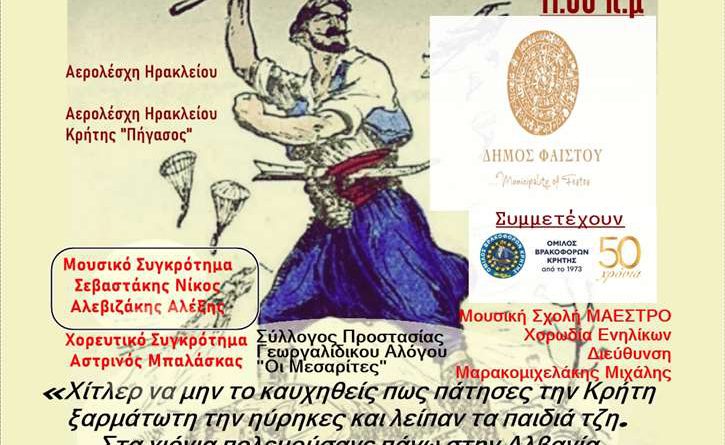 Ο Δήμος Φαιστού τιμά τους ήρωες της Μάχης της Κρήτης και διοργανώνει επετειακή εκδήλωση για τα 82 χρόνια από την ηρωική μάχη που έδωσε ο Κρητικός λαός, την Κυριακή 11 Ιουνίου, στις 11.00 η ώρα το πρωί, στο Τυμπάκι Δήμου Φαιστού και στο πρώην στρατόπεδο ΠΕΚ(Δέλτα Κόκκινου Πύργου).