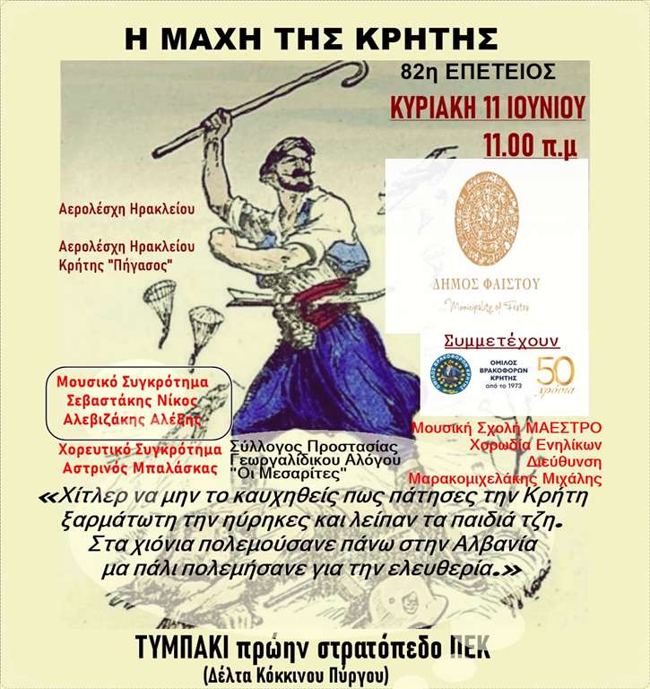 Ο Δήμος Φαιστού τιμά τους ήρωες της Μάχης της Κρήτης και διοργανώνει επετειακή εκδήλωση για τα 82 χρόνια από την ηρωική μάχη που έδωσε ο Κρητικός λαός, την Κυριακή 11 Ιουνίου, στις 11.00 η ώρα το πρωί, στο Τυμπάκι Δήμου Φαιστού και στο πρώην στρατόπεδο ΠΕΚ(Δέλτα Κόκκινου Πύργου).