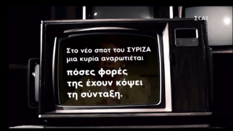 Ήταν την περασμένη Πέμπτη (16.05.2019) όταν ο ΣΥΡΙΖΑ έδωσε στη δημοσιότητα ένα νέο τηλεοπτικό σποτ ενόψει των ευρωεκλογών. Ένα σποτ αφιερωμένο στις περικοπές συντάξεων μέχρι το 2014. «Ούτε θυμάμαι πια πόσες φορές μου έκοψαν τη σύνταξη. Δεν το πίστευες πια», έλεγε η συμπαθέστατη συνταξιούχος που πρωταγωνιστεί. Στο σποτ γίνεται και ένα flashback στα χρόνια των περικοπών στις συντάξεις, με την ηλικιωμένη γυναίκα να ακούει από τις ειδήσεις τις περικοπές.