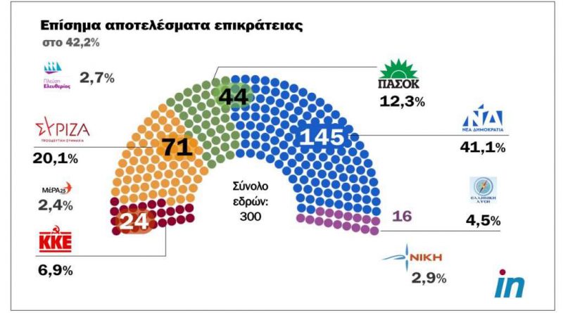 Θυμίζουμε ότι το 2019 η Νέα Δημοκρατία είχε πάρει 39,85% και 158 έδρες.