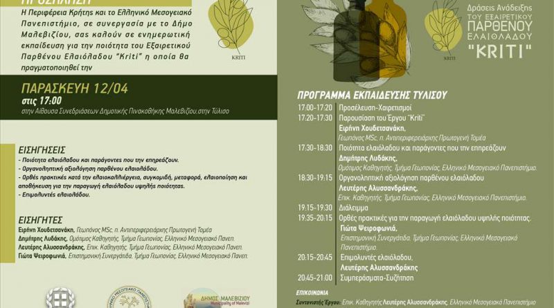 Την ανάδειξη και βελτίωση του παραγόμενου ελαιόλαδου έχει στόχο η εκπαιδευτική δράση για ελαιοπαραγωγούς, που διοργανώνεται από την Περιφέρεια Κρήτης σε συνεργασία με το Δήμο Μαλεβιζίου και το Ελληνικό Μεσογειακό Πανεπιστήμιο την Παρασκευή 12 Απριλίου στις 17.00 στη Δημοτική Πινακοθήκη Μαλεβιζίου στην Τύλισο.