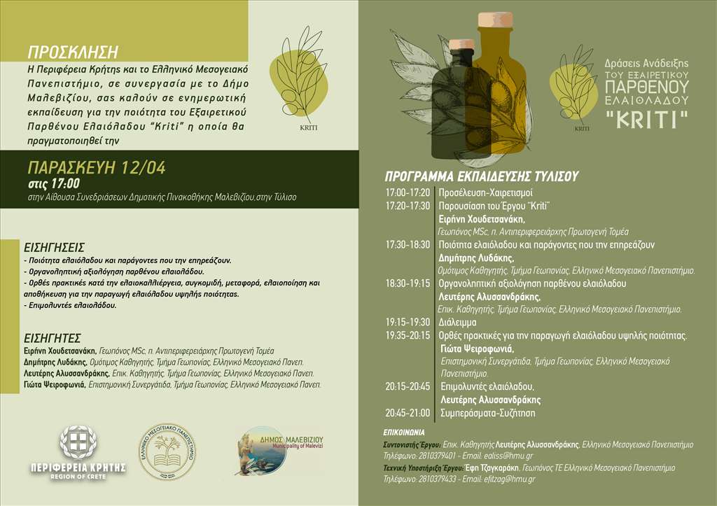Την ανάδειξη και βελτίωση του παραγόμενου ελαιόλαδου έχει στόχο η εκπαιδευτική δράση για ελαιοπαραγωγούς, που διοργανώνεται από την Περιφέρεια Κρήτης σε συνεργασία με το Δήμο Μαλεβιζίου και το Ελληνικό Μεσογειακό Πανεπιστήμιο την Παρασκευή 12 Απριλίου στις 17.00 στη Δημοτική Πινακοθήκη Μαλεβιζίου στην Τύλισο.