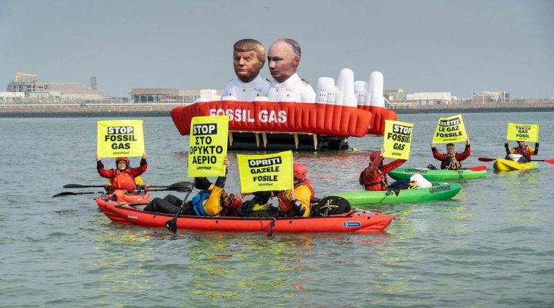 Στην είσοδο του τερματικού σταθμού Zeebrugge, ακτιβιστές εγκατέστησαν νωρίς το απόγευμα της Τετάρτης, μια φουσκωτή κατασκευή μήκους 10 μέτρων, που απεικονίζει τον Βλαντιμίρ Πούτιν και τον Ντόναλντ Τραμπ σε ένα δεξαμενόπλοιο μεταφοράς αερίου. Δίπλα της, το ιστιοφόρο Witness του διεθνούς γραφείου της Greenpeace φέρει ένα πανό με το σύνθημα “Αυτοί αγαπούν το αέριο, εσύ πληρώνεις το τίμημα. STOP στο ορυκτό αέριο”, ενώ ακτιβιστές της οργάνωσης σε 44 καγιάκ εμποδίζουν την πρόσβαση στον τερματικό σταθμό για περισσότερες από 18 ώρες!. [3]