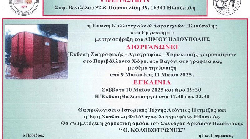 Η Ένωση Καλλιτεχνών & Λογοτεχνών Ηλιούπολης «Το Εργαστήρι» διοργανώνει με την υποστήριξη του Δήμου Ηλιούπολης, Έκθεση Ζωγραφικής – Αγιογραφίας – Χαρακτικής – Χειροποίητων με θέμα την Άνοιξη, από 9 Μαΐου έως 11 Μαΐου 2025, από τις 17.30 μ.μ. έως τις 22.30 μ.μ. στον περιβάλλοντα χώρο, στο Βαγόνι (Γραφεία Ένωσης, Σοφοκλή Βενιζέλου 92 & Πουσουλίδη 39).