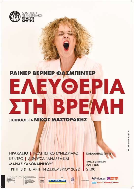 Η παράσταση «Ελευθερία στη Βρέμη» του Ράινερ Βέρνερ Φάσμπιντερ, χειμερινή παραγωγή του ΔΗΠΕΘΕ Κρήτης, για την περίοδο 2022-23, έκανε πρεμιέρα στα Χανιά στις 30 Νοεμβρίου, σε νέα μετάφραση του Γιώργου Δεπάστα, διασκευή, σκηνοθεσία, σκηνικά, κοστούμια, μουσική επιμέλεια Νίκου Μαστοράκη και με μια εξαιρετική ομάδα ηθοποιών και συντελεστών. Η παράσταση θα περιοδεύσει στη συνέχεια σε όλη την Κρήτη.