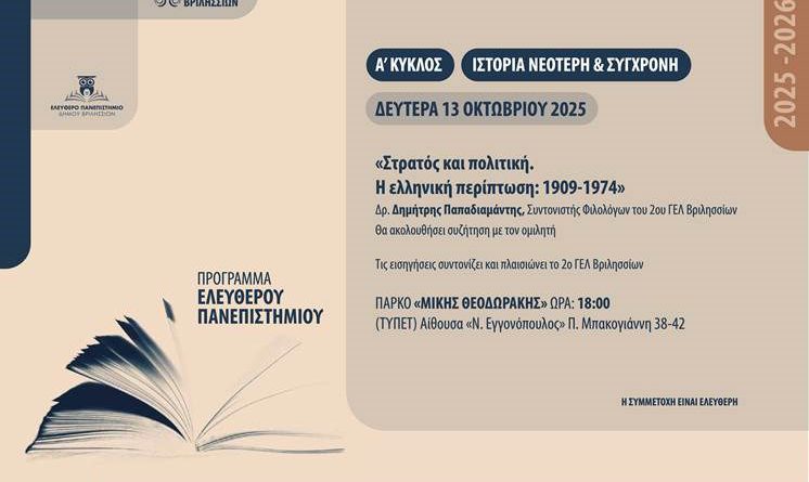 Η διάλεξη με θέμα «Στρατός και πολιτική. Η Ελληνική περίπτωση 1909-1974» του Δρ. Δημήτρη Παπαδιαμάντη, Συντονιστή Φιλολόγων του 2ου Γενικού Λυκείου Βριλησσίων θα αναλύσει τον ρόλο του στρατού και πως επηρέασε καθοριστικά τις εξελίξεις στην Ελλάδα του 20ού αιώνα, με αναφορές στα ιστορικά γεγονότα, τις κοινωνικές συνθήκες και τις πολιτικές επιπτώσεις.