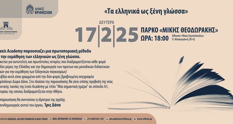 Μια πρωτοποριακή μέθοδο για την εκμάθηση των ελληνικών ως ξένη γλώσσα θα παρουσιάσει το Ελεύθερο Πανεπιστήμιο του Δήμου Βριλησσίων τη Δεύτερα 17/2/2025 στις 18:00 στην αίθουσα «Ν. Εγγονόπουλος» του πάρκου Μ. Θεοδωράκης (πρ. ΤΥΠΕΤ).