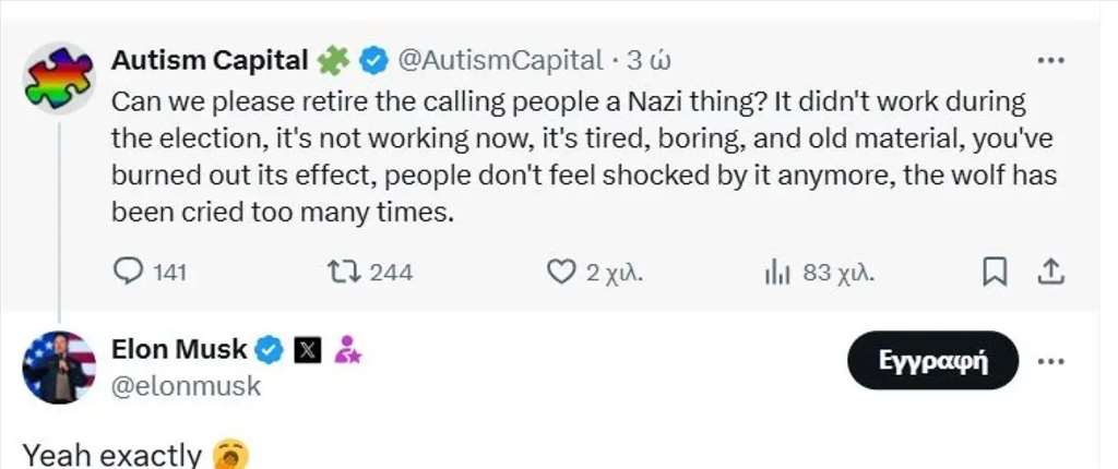 «Μπορούμε να σταματήσουμε να αποκαλούμε τους ανθρώπους Ναζί; Δεν λειτούργησε την προεκλογική περίοδο, δεν λειτουργεί και τώρα, είναι κουραστικό, βαρετό και παλιό. Δεν περνάει πια, οι άνθρωποι δεν σοκάρονται από αυτό» ήταν όσα έγραψε ένας χρήστης Χ, με τον Έλον Μασκ να απαντά από κάτω «ναι, αυτό ακριβώς». Στο βίντεο πάντως που ανέβασε η ομάδα του Μασκ στον λογαριασμό του στο Χ, η συγκεκριμένη σκηνή έχει «κοπεί». Στη θέση του χαιρετισμού εμφανίζονται θεατές να τον χειροκροτούν. Για την ιστορικό Κλερ Όμπιν, ειδική στο ζήτημα του ναζισμού στις ΗΠΑ, δεν υπάρχει αμφιβολία: “Ο Ίλον Μασκ έκανε όντως το «ζιγκ χάιλ», τον ναζιστικό χαιρετισμό”, σχολίασε μέσω X.