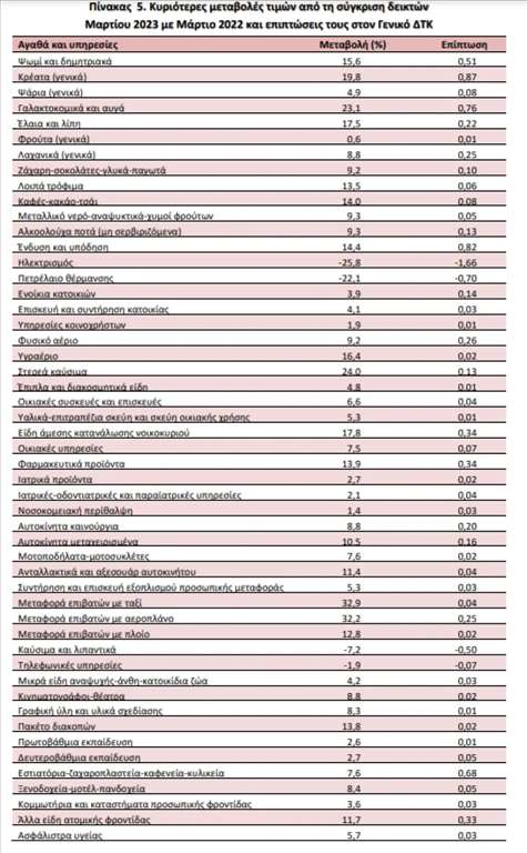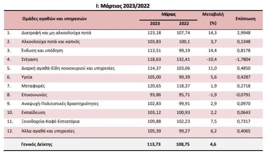 Η αύξηση του Γενικού Δείκτης Τιμών Καταναλωτή κατά 4,6% τον μήνα Μάρτιο 2023, σε σύγκριση με τον αντίστοιχο Δείκτη του Μαρτίου 2022, προήλθε κυρίως από τις μεταβολές στις ακόλουθες ομάδες αγαθών και υπηρεσιών: