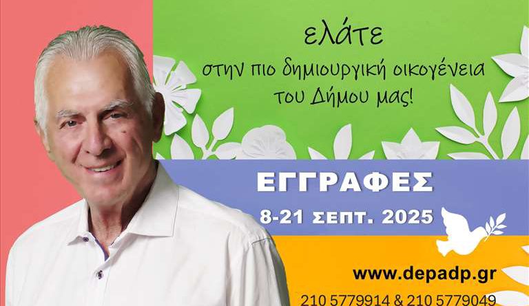 Ο Δήμος Περιστερίου ανακοινώνει ότι οι εγγραφές για τα Δημιουργικά Εργαστήρια για τη νέα περίοδο θα πραγματοποιηθούν οι εγγραφές Online μέσω της ψηφιακής πλατφόρμας www.depadp.gr από τη Δευτέρα 8 Σεπτεμβρίου έως και την Κυριακή 21 Σεπτεμβρίου 2025.