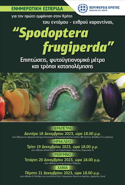 Η Περιφέρεια Κρήτης διοργανώνει ενημερωτικές εσπερίδες με θέμα : «Πρώτη εμφάνιση του, για την πρώτη εμφάνιση του εντόμου – εχθρού καραντίνας «Spodoptera fruigipedra» στην Κρήτη, για την αποφυγή δυσμενών επιπτώσεων.