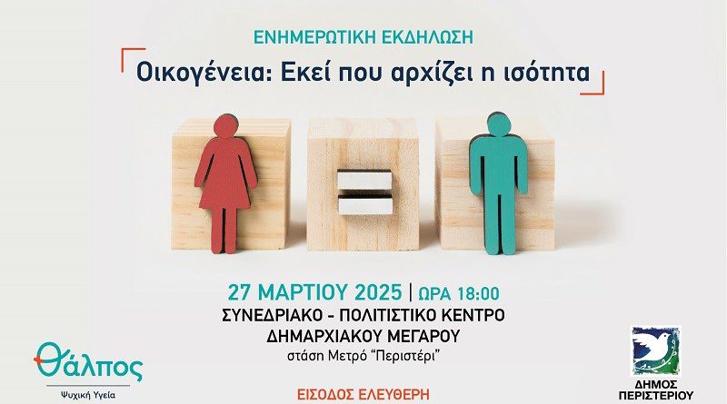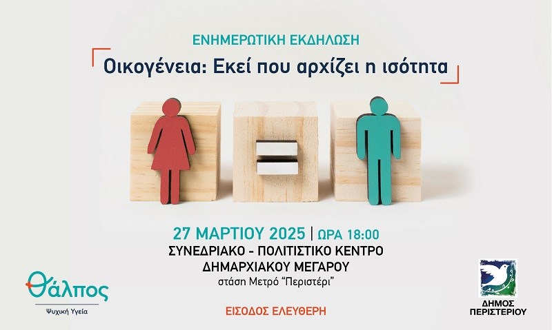Η Κοινωνική Υπηρεσία Δήμου Περιστερίου και Κέντρο Ημέρας για την Υποστήριξη της Οικογένειας «Θάλπος» – Ψυχική Υγεία, συνδιοργανώνουν ενημερωτική εκδήλωση με θέμα "Ισότητα στην Οικογένεια: Δικαιώματα, Ρόλοι και Προκλήσεις", στις 27 Μαρτίου 2025 και ώρα 18:00, στο συνεδριακό – πολιτιστικό κέντρο του Δημαρχιακού Μεγάρου (στάση Μετρό «Περιστέρι»). Είσοδος Ελεύθερη!