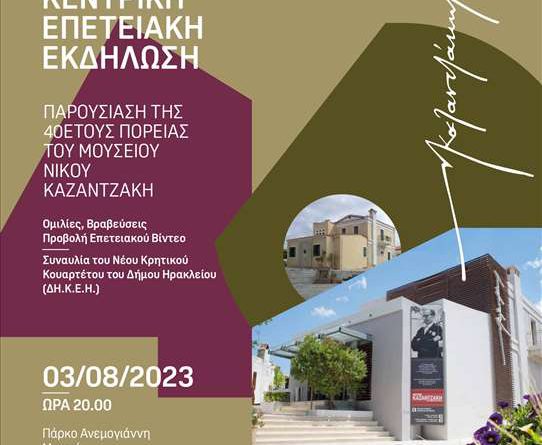 Το Μουσείο Νίκου Καζαντζάκη σε συνδιοργάνωση με την Περιφέρεια Κρήτης, τον Δήμο Αρχανών-Αστερουσίων και τον Δήμο Ηρακλείου διοργανώνει κεντρική επετειακή εκδήλωση με τίτλο «40 χρόνια Μουσείο Νίκου Καζαντζάκη», την Πέμπτη 3 Αυγούστου 2023 και ώρα 20.00 στο πάρκο Ανεμογιάννη, στη Μυρτιά.