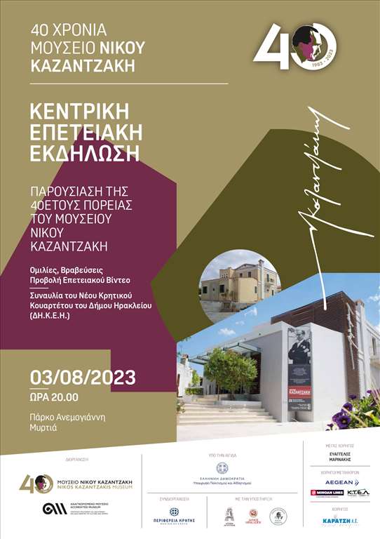 Το Μουσείο Νίκου Καζαντζάκη σε συνδιοργάνωση με την Περιφέρεια Κρήτης, τον Δήμο Αρχανών-Αστερουσίων και τον Δήμο Ηρακλείου διοργανώνει κεντρική επετειακή εκδήλωση με τίτλο «40 χρόνια Μουσείο Νίκου Καζαντζάκη», την Πέμπτη 3 Αυγούστου 2023 και ώρα 20.00 στο πάρκο Ανεμογιάννη, στη Μυρτιά.