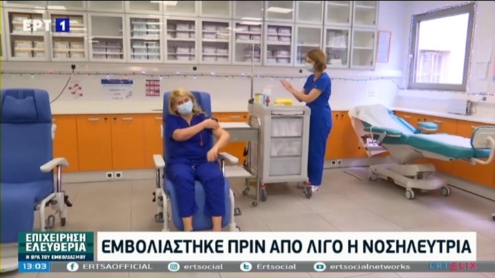 Ιστορική ημέρα για την Ελλάδα, καθώς αποτελεί γεγονός ο πρώτος εμβολιασμός κατά του κορονοϊού. Πρόκειται για τη νοσηλεύτρια της ΜΕΘ του νοσοκομείου "Ευαγγελισμός", Ευσταθία Καμπισιούλη, η οποία εμβολιάστηκε γύρω στις 13.00. Η ίδια την ώρα που συνάδελφός της τής έκανε το εμβόλιο, σχημάτισε με το χέρι της το σήμα της νίκης και ότι όλα είναι εντάξει. Στο τέλος, οι παρευρισκόμενοι ξέσπασαν σε χειροκροτήματα.