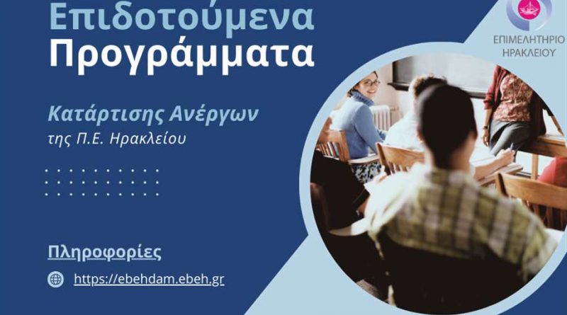 Συνεχίζεται η υποβολή αιτήσεων για συμμετοχή στα επιδοτούμενα προγράμματα κατάρτισης ανέργων της Περιφερειακής Ενότητας Ηρακλείου που θα υλοποιηθούν από το Επιμελητήριο Ηρακλείου.