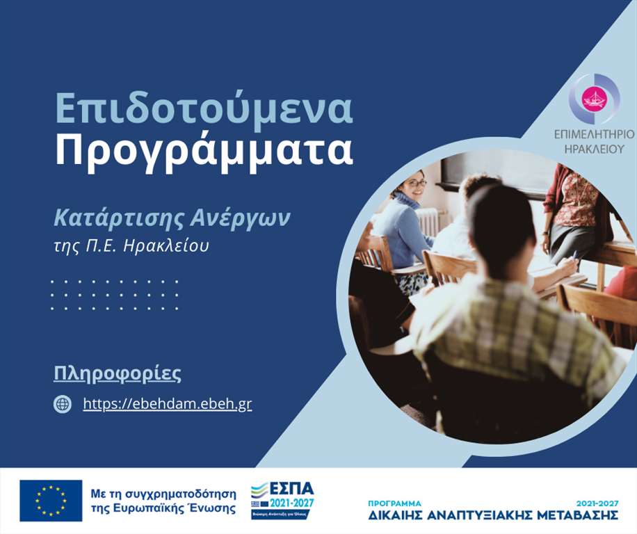 Υπενθυμίζεται ότι τα εν λόγω προγράμματα, τα οποία θα υλοποιηθούν στο πλαίσιο της πράξης «Δράσεις προώθησης στην απασχόληση για ανέργους μέσω συμβουλευτικής, κατάρτισης, πρακτικής άσκησης και πιστοποίησης δεξιοτήτων, στην Περιφέρεια της Κρήτης», θα αφορούν εξειδικευμένα αντικείμενα κατάρτισης που συνδέονται με την πράσινη και τη γαλάζια οικονομία και θα περιλαμβάνουν εκπαιδευτικό επίδομα έως 2.250 ευρώ.