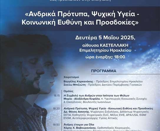 Το Επιμελητήριο Ηρακλείου και το Δίκτυο Παρέμβασης Γυναικών Κρήτης σας προσκαλούν στην εκδήλωση «Ανδρικά Πρότυπα, Ψυχική Υγεία – Κοινωνική Ευθύνη και Προσδοκίες». Αύριο, Δευτέρα 5 Μαΐου 2025 αίθουσα ΚΑΣΤΕΛΛΑΚΗ Επιμελητηρίου Ηρακλείου ώρα έναρξης: 18:00